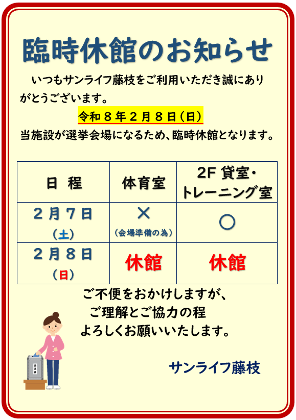 令和8年2月8日(日)は選挙会場のため休館いたします 2026年1月21日 新着情報 by sunlife-fujieda4111. 令和8年2月8日(日)は選挙会場となるため休館いたします。 また、前日の2月7日(土)は選挙準備のため体育室のみ使用不可となります。 ご了承ください。 前の記事