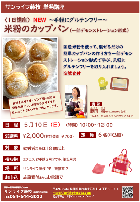 • 内容:国産米粉を使って混ぜるだけの、簡単カップパン作り方を一部デモンストレーション形式で学び、気軽にグルテンフリーを取り入れましょう