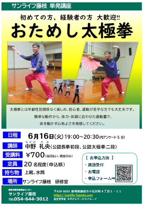 • 内容:太極拳とは年齢性別関係なく楽しめ、初心者、運動が苦手な方でも大丈夫です。簡単な動作から、体力・体調に合わせた運動量で、体を動かす心地よさを実感してください。