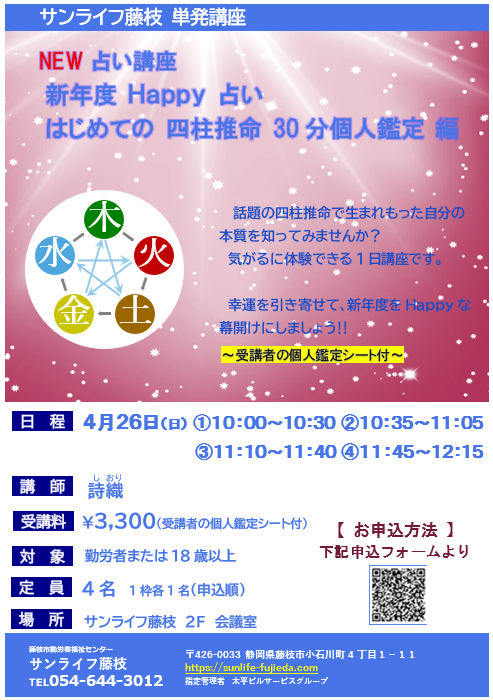 • 4月26日新年度 Happy占い はじめての四柱推命 申込フォーム​≫